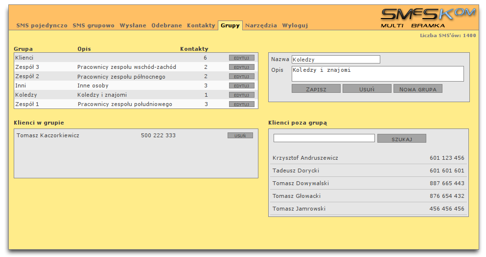 GrupyKażdy kontakt może być przyporządkowany do dowolnej liczby grup. Grupy pozwalają nie tylko na zarządzanie kontaktami, ale również na szybkie wysyłanie sms'ów grupowych. |