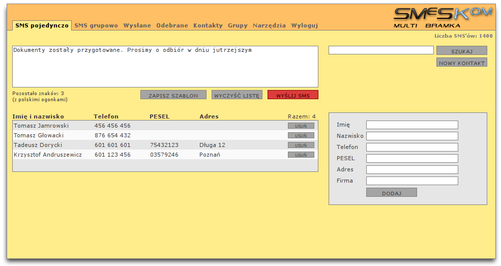 Wysyłanie pojedynczeWysyłanie SMS'ów do pojedynczych kontaktów to podstawowa funkcja aplikacji. SMS można wysłać do jednego lub kilku wybranych z listy kontaktów. |